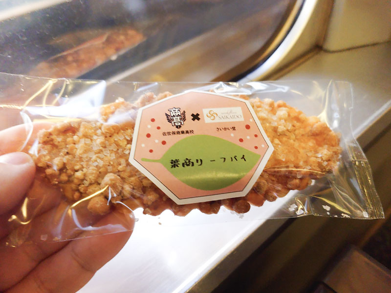 会場ロビーでは、プレゼンターが企画開発した商品の一部が実際に販売されていました。写真の「葉商リーフパイ」は佐世保商業高校の生徒が地元の洋菓子店・さいかい堂の協力を得て開発し販売している商品です。帰りの電車で美味しくいただきました。